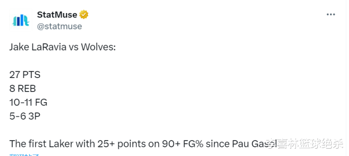 11投10中,三分球6投5中,罚球5中2,轰下27分8篮板2助攻1抢断1盖帽,拉拉维亚打出了加盟湖人以来最出色的一战,也帮助湖人以116比115击败森林狼,取得球队新赛季第三场胜利。湖人目前战绩3胜2负,在饱受伤病困扰的情况下取得这样的成绩已经很难得。